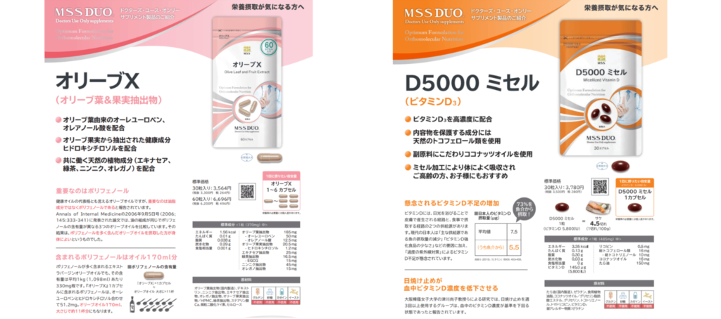 サプリメントはMSS製品がおすすめです。医療機関で最も採用されており、サプリメントとしての衛生管理はもちろん臨床データもしっかりしています。口にするものだからこそ、安心安全・根拠があるものにこだわりたいと思います。