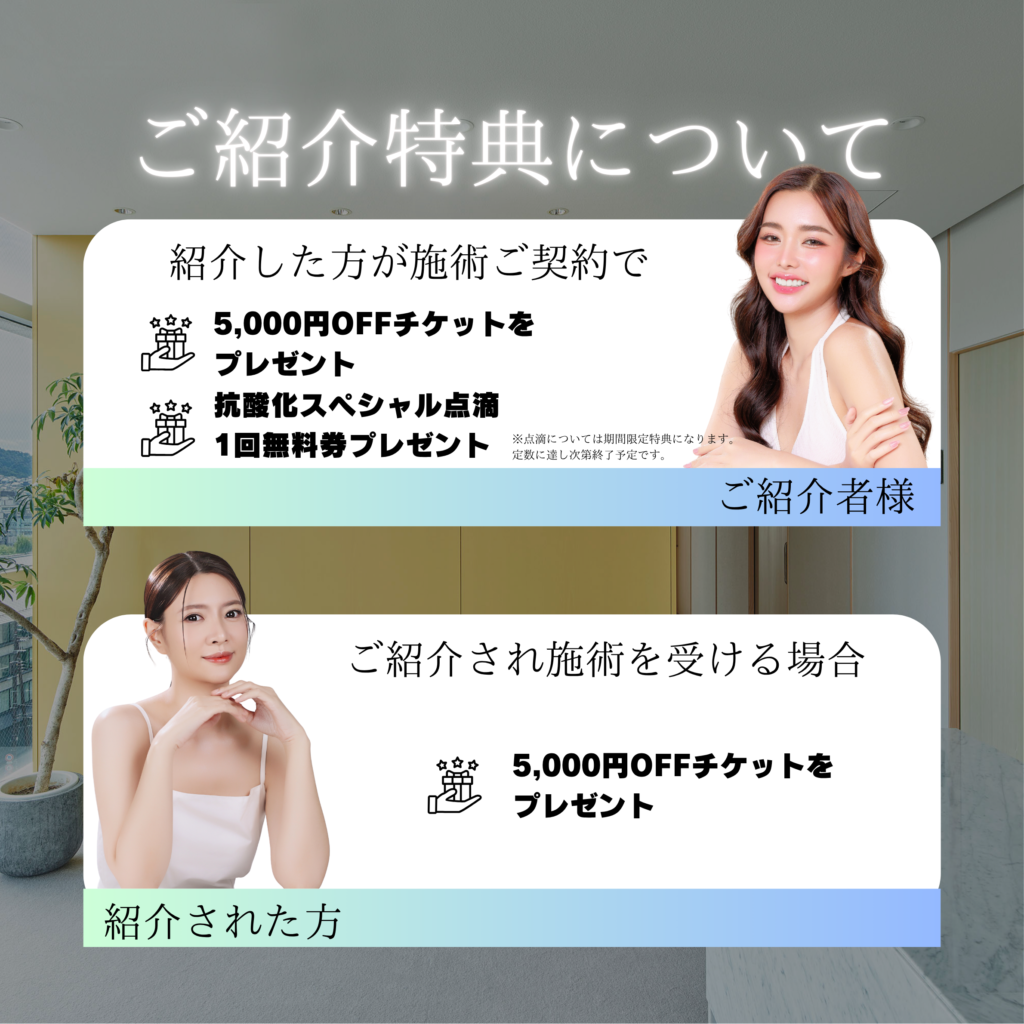 紹介者様・ご新規様へ¥5,000円オフチケットを贈呈✨さらに、導入を記念して紹介者様へ抗酸化スペシャル点滴1回無料券も贈呈いたします!(こちらの抗酸化スペシャル点滴については、定員に達ししだい終了となります)