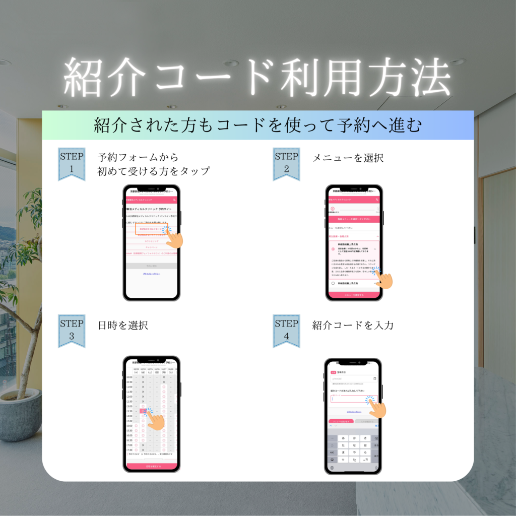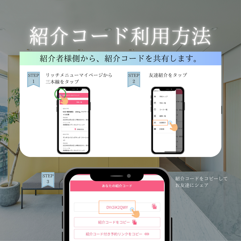 皆様こんにちは。当院では、健康美の輪を広げていきたいという想いから友達紹介特典を導入しました。当院をご利用されたことがある方のみが紹介者様になります。患者様のご家族やご友人、職場仲間など…大切な方の健康やいつまでも若々しく過ごせる身体のサポートを、当院にお任せください。
