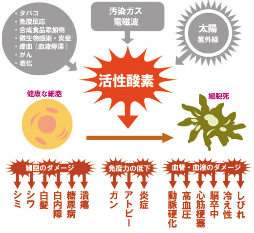 適度な「良い活性酸素」は体の防御やシグナル伝達に欠かせませんが、過度に増えた「悪い活性酸素」は、細胞膜やDNAを傷つけ、疲労や炎症のもととなって全身の代謝や免疫力を鈍らせます。酸化とは、身体の内側で起こる「さび」のようなものです。